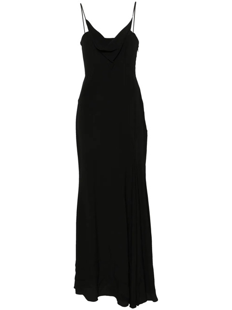 black crepe texture panelled design rear cut-out detailing cowl neck concealed side hook and zip fastening spaghetti straps flared hem long length silk lining