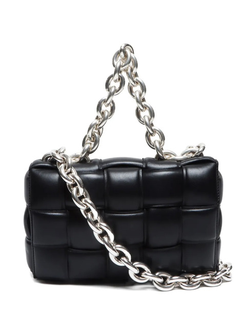 circa 2012-2023 black nappa leather signature Intrecciato design single chain-link top handle chain-link shoulder strap foldover top with magnetic fastening main compartment internal zip-fastening pocket silver-tone hardware Condition: GOOD. This previously owned and used item is in good condition with minimal signs of use. This may include fading of material or plating and scratches.