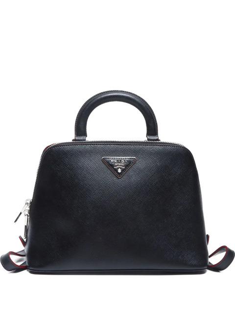 circa 2010-2020 black Saffiano leather all-around zip fastening two adjustable shoulder straps single top handle triangle logo contrasting trim main compartment internal slip pocket silver-tone hardware Condition: GOOD. This previously owned and used item is in good condition with minimal signs of use. This may include fading of material or plating and scratches.