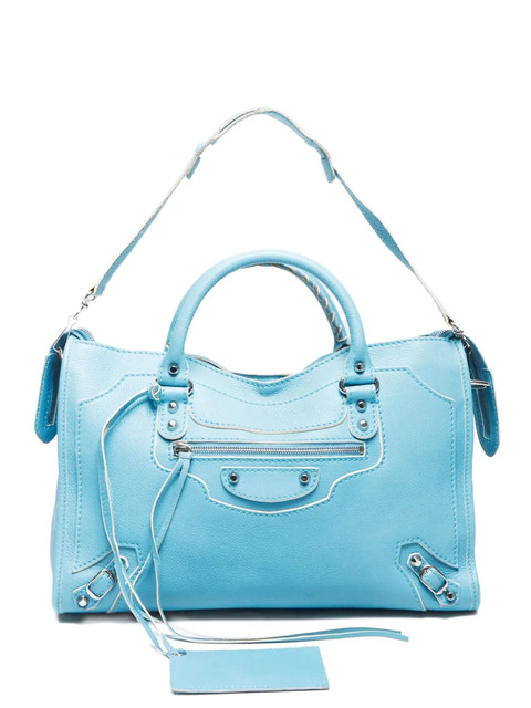 Lambskin large City tote bag, light blue. Features an adjustable detachable shoulder strap, rolled top handles that close with a zipper, and the same color decorative buckle detail on both sides. Main compartment secured by a front zipper fastening and includes an internal zip-fastening pocket as well as one in the main section. Additionally features a decorative buckle detail on the front flap. Fully lined interior with internal Balenciaga logo patch. Condition: Good. Minimal signs of use present, including potential fading of material or plating and minor scratches.