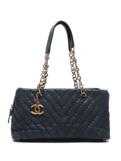 circa 2011 dark green leather signature V-stitch quilting signature interlocking CC logo two leather and chain-link top handles open top partitioned compartment internal zip-fastening pocket gold-tone hardware Serial number: 14833142 This item comes with an original Chanel authenticity card. This item comes with an original authenticity seal. Condition: GOOD. This previously owned and used item is in good condition with minimal signs of use. This may include fading of material or plating and scratches.