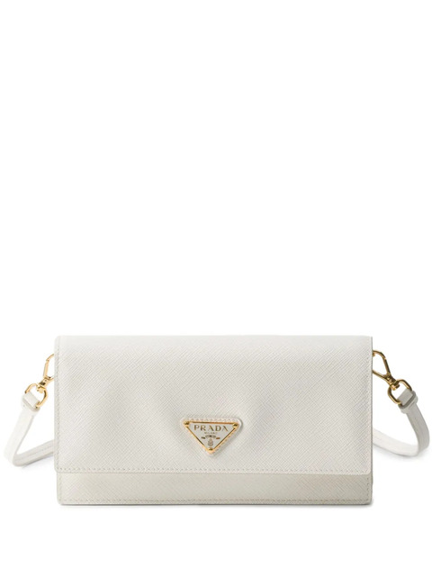 white Saffiano leather textured finish triangle logo gold-tone hardware adjustable detachable shoulder strap foldover top with magnetic fastening main compartment internal card slots