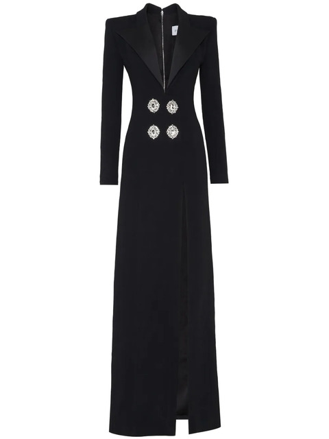 black cady texture stretch-design crystal-embellished buttons satin trim wide peak lapels plunging V-neck concealed rear zip fastening long sleeves fitted waistline side slit long length straight hem
