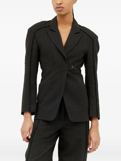 A GANNI tweed blazer in black. Features a single-button fastening and notched lapel. The design includes frayed edges and padded shoulders.