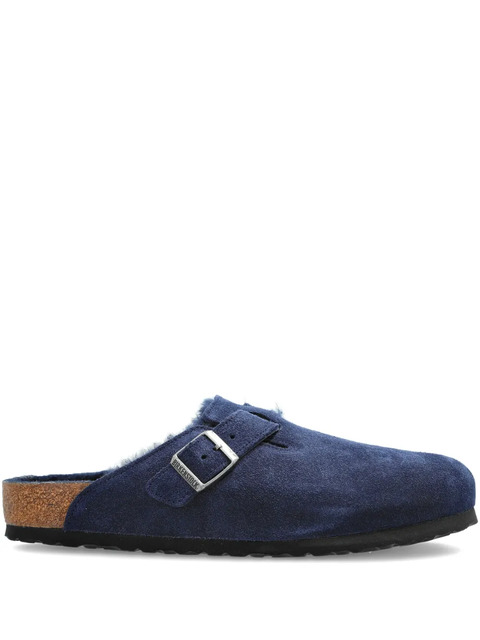 dark blue suede upper buckle fastening shearling lining cork footbed rubber sole