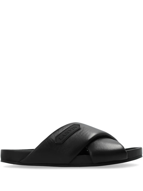 black lambskin padded design logo patch to the side crossover strap at the toe open toe moulded footbed flat rubber sole